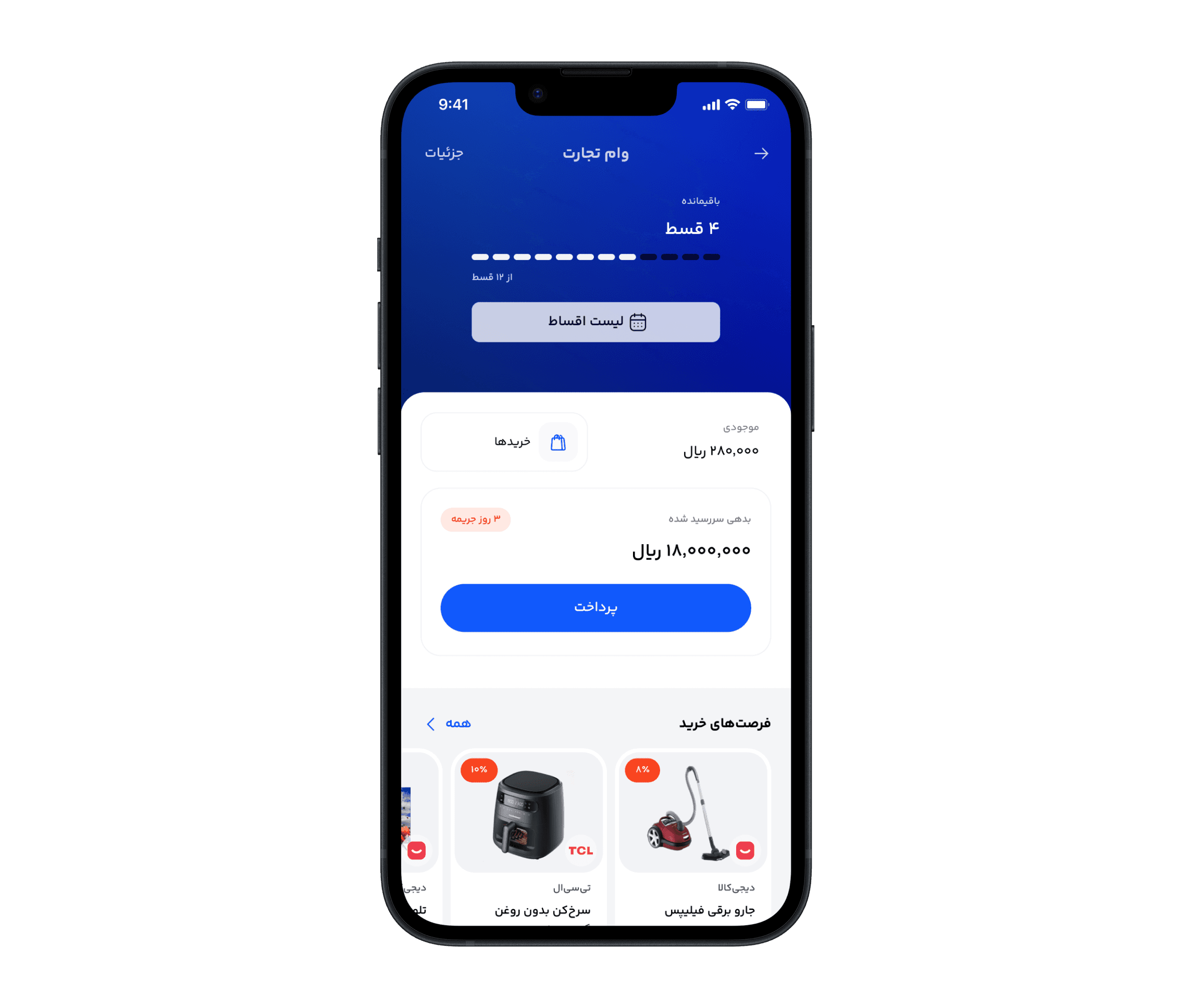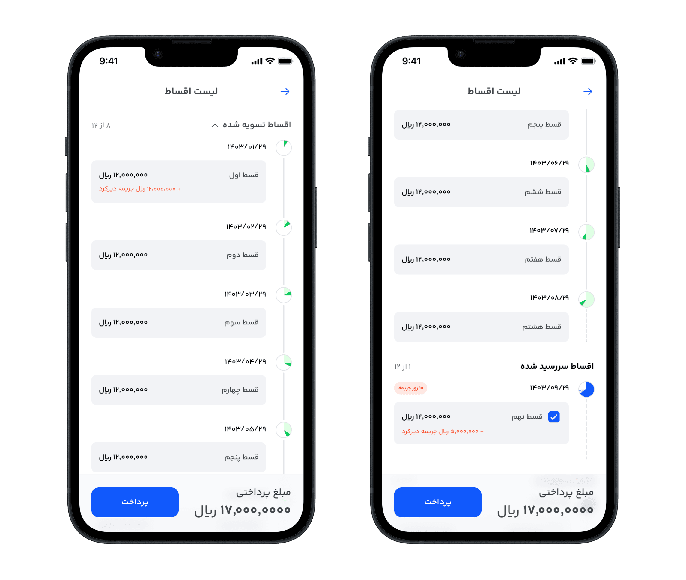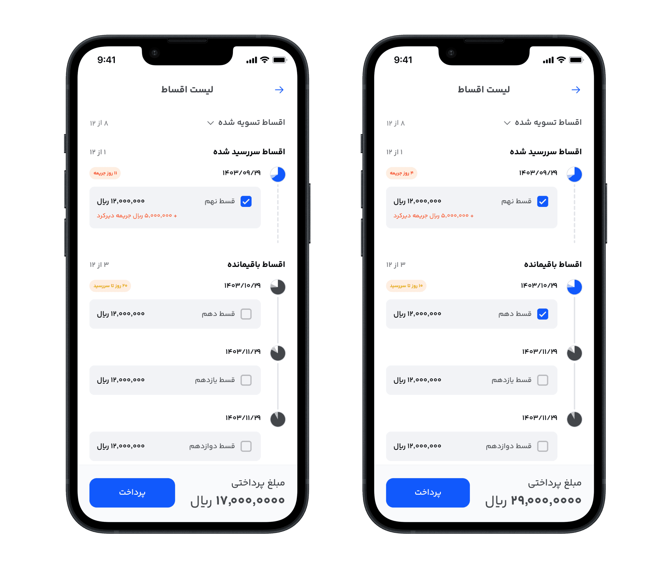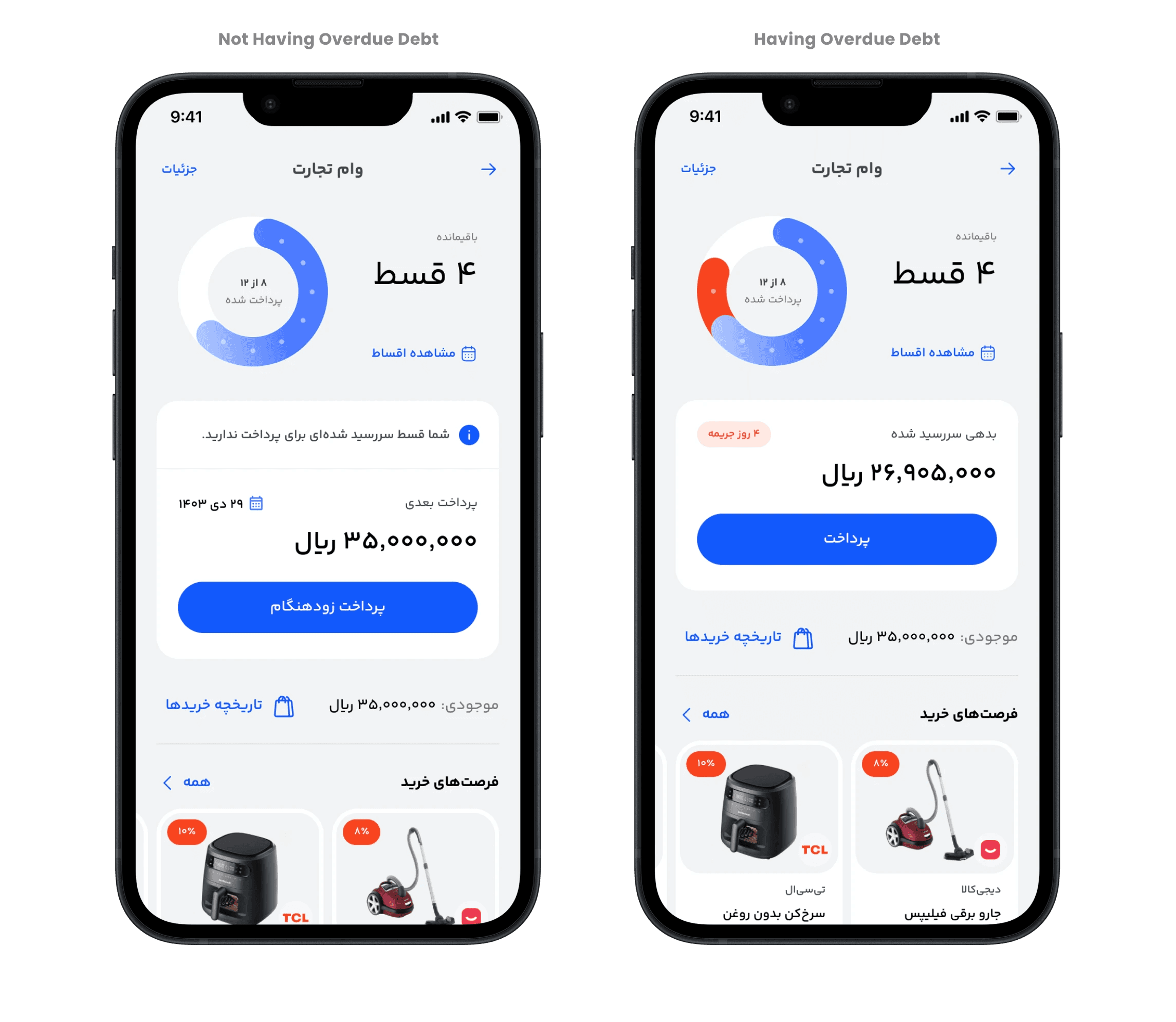 If an installment is overdue, the user sees the number of penalty days accrued. If there are no overdue installments, the UI instead highlights the due date of the next upcoming installment.